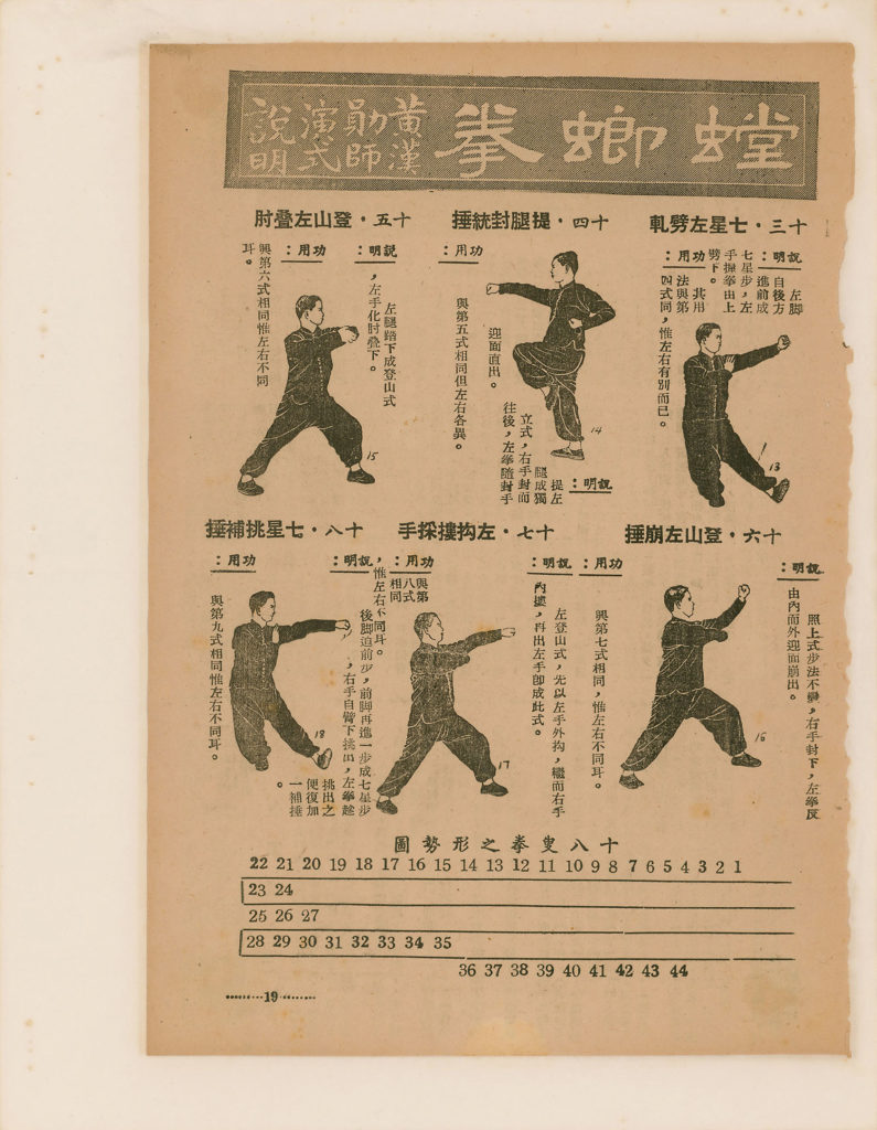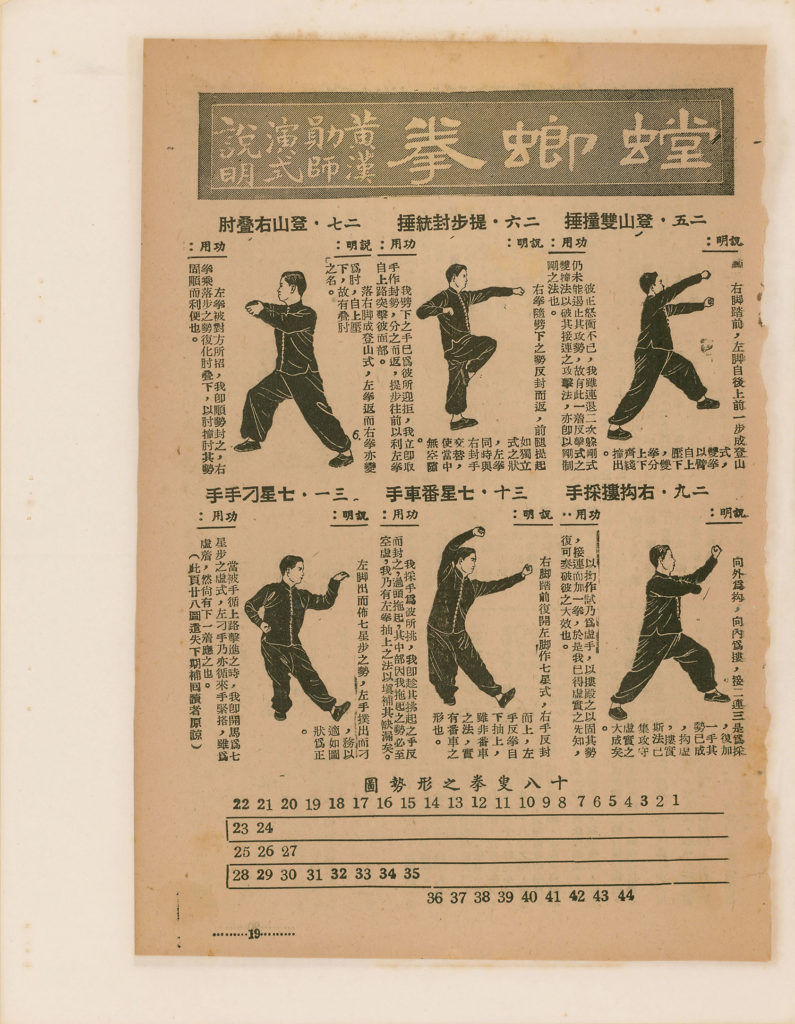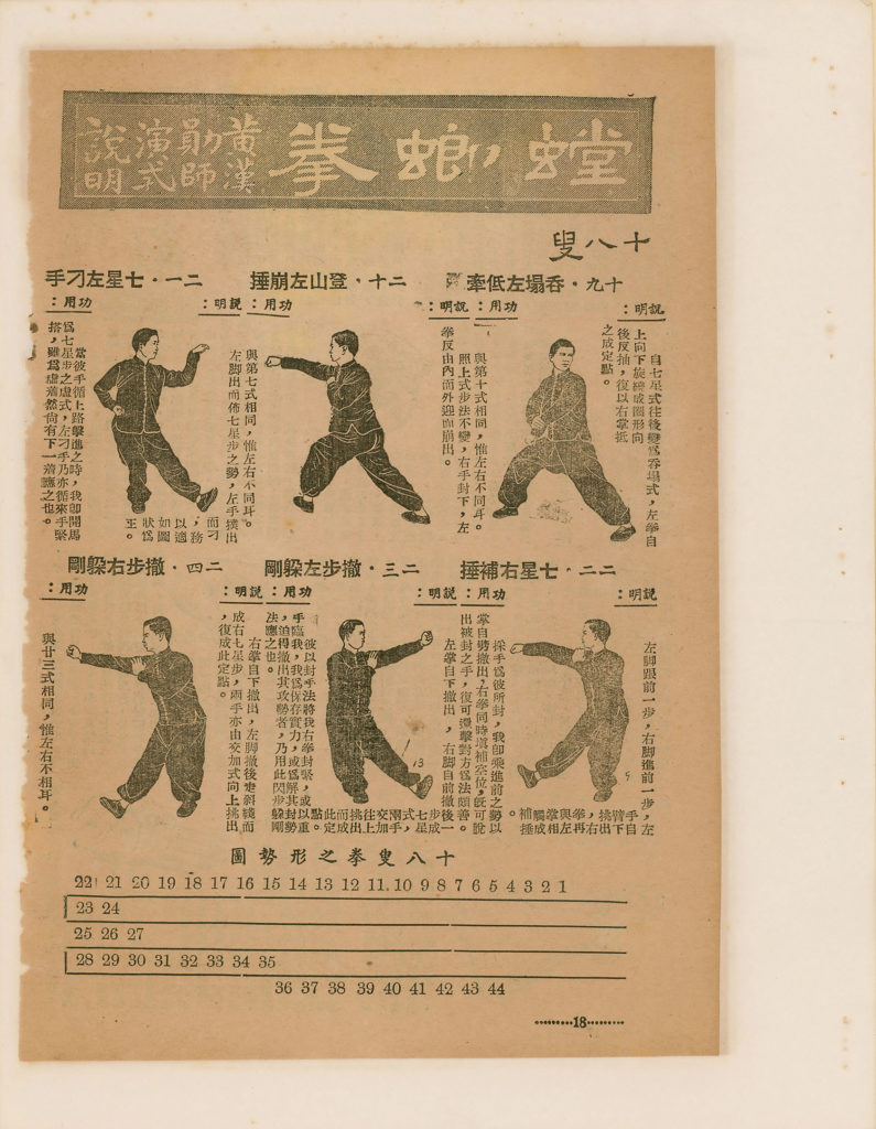 螳螂拳之系統組織,乃集合十七家宗法而成,剛柔互濟,長短並用,且快而不浮,穩而不滯;習之愈久,愈覺其奧妙處,弗能宣諸筆墨也。